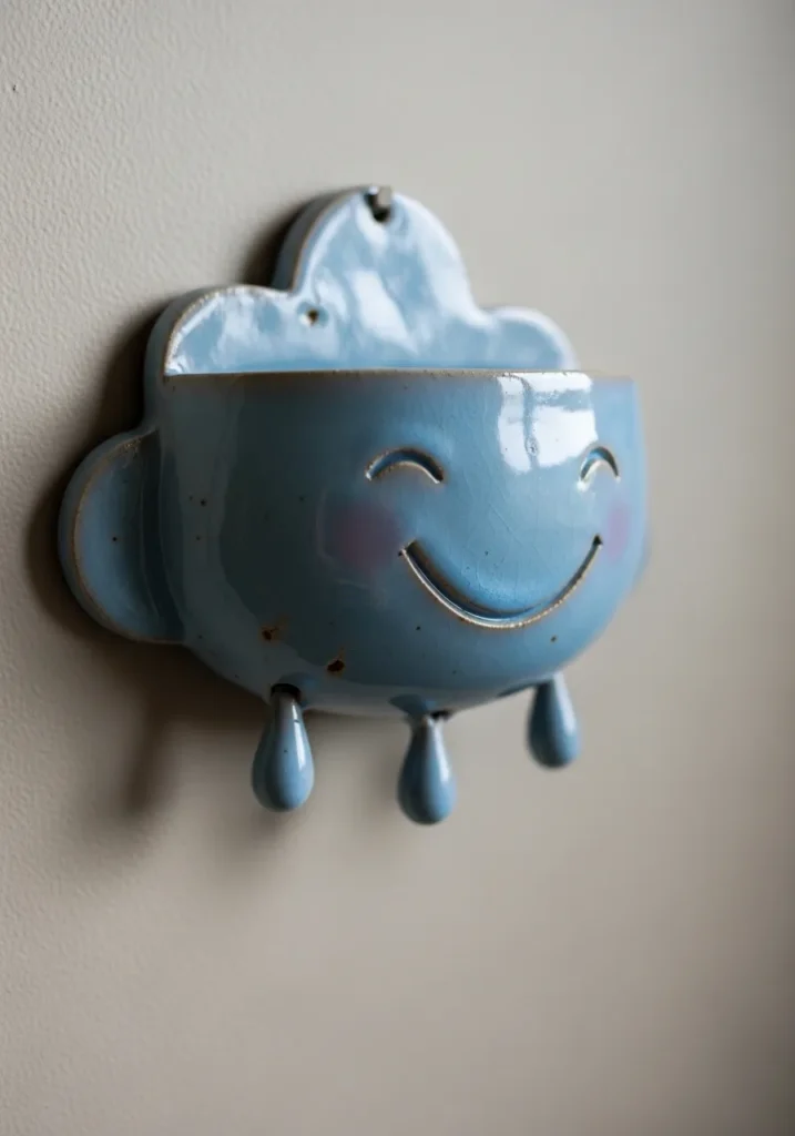 This sweet ceramic wall pocket is shaped like a puffy little cloud with the happiest face. The soft sky blue glaze gives it a glossy, cheerful finish, while tiny sculpted raindrops hang delicately from the bottom. The top opening is perfect for holding small dried flowers or even a mini air plant. The smooth rounded edges and simple facial details keep the design playful without feeling overworked.