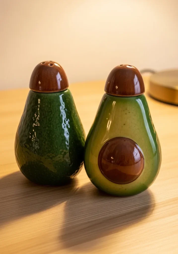 This cute ceramic salt and pepper set is shaped like two ripe avocados. The glossy green glaze transitions from darker skin tones to lighter inner flesh, and the brown pits add a fun focal point. The rounded forms feel smooth and satisfying in hand. The simple design keeps it modern while still being playful.