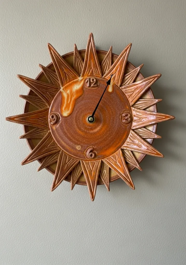 This eye catching ceramic wall clock is shaped like a dramatic sunburst with layered pointed rays radiating outward. The warm amber and copper toned glaze gives it a rich, glossy finish that catches the light beautifully. Subtle carved lines add texture to each ray, while the circular center holds the clock face with simple numbers and sleek hands. The combination of sculpted dimension and warm earthy tones makes it feel both artistic and functional.