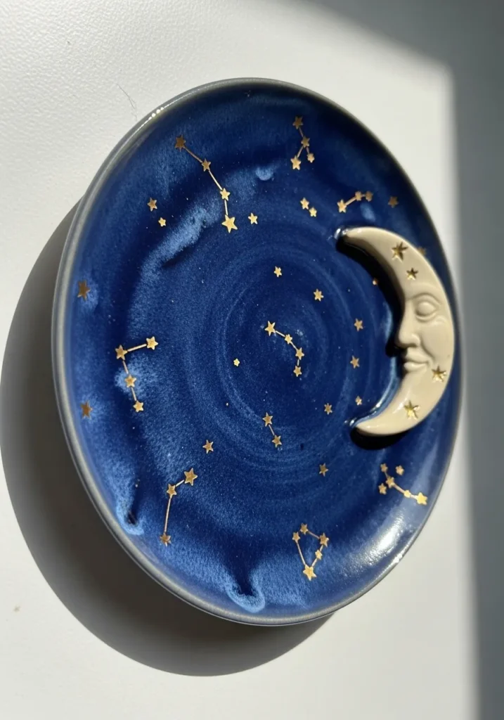 This deep blue ceramic wall plate feels like a tiny night sky captured in clay. The glossy glaze shifts between rich navy and lighter sapphire tones, with tiny gold star details scattered across the surface. A sculpted crescent moon sits slightly raised, adding dimension and a soft sculptural touch. The circular shape keeps it classic, while the dreamy cosmic theme gives it a magical twist. The smooth glaze and subtle texture variations make it feel handcrafted and special.