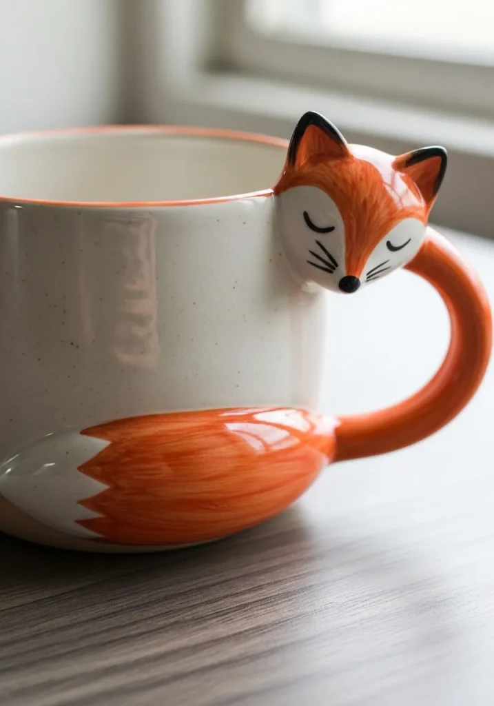 This charming ceramic mug features a sweet little fox curled around the side, with its tail forming part of the design near the base. The creamy white body contrasts beautifully with the bright orange glaze on the fox and the matching handle. The glossy finish highlights the smooth curves, while the sculpted fox face adds a gentle touch of personality. It feels sturdy and comforting, perfect for holding a warm drink on a quiet afternoon.