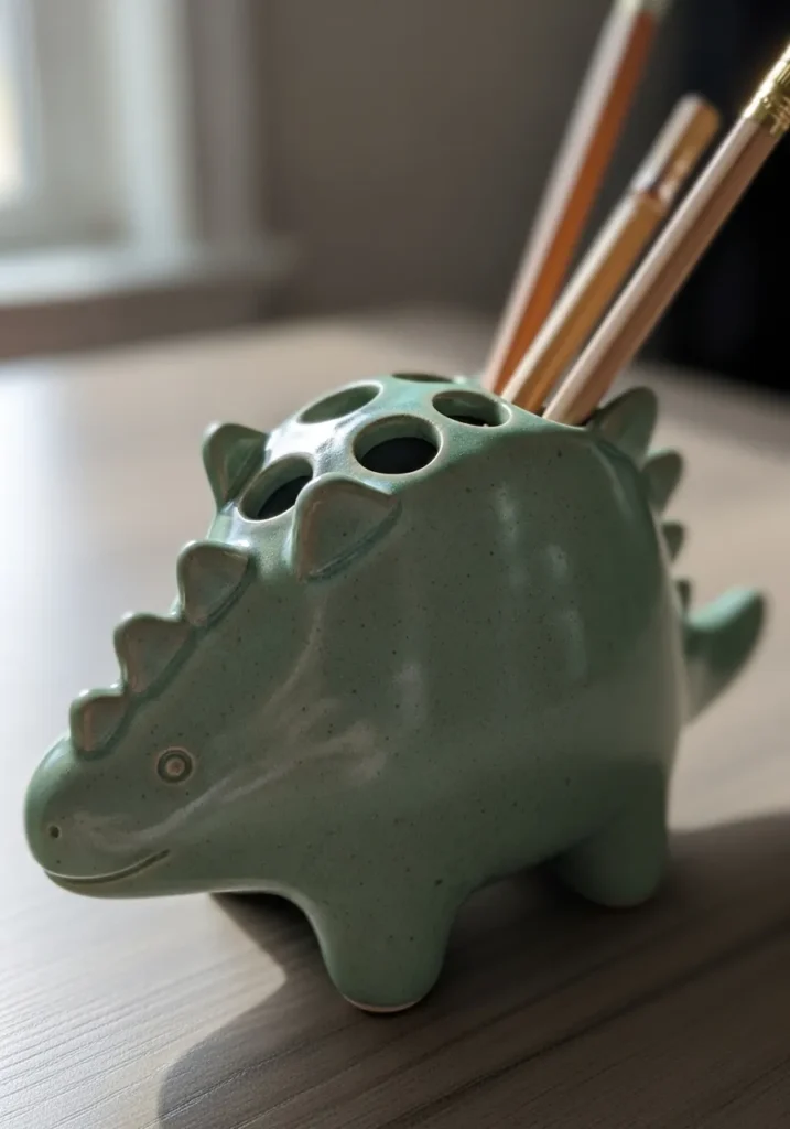 This soft green dinosaur pencil holder is equal parts cute and functional. The rounded ceramic body is glazed in a muted sage tone, with small sculpted spikes running along its back. Several evenly spaced holes on top make it perfect for holding brushes or pencils, while the smooth glossy finish gives it a polished look. The simple facial details keep it charming without being overly cartoonish.