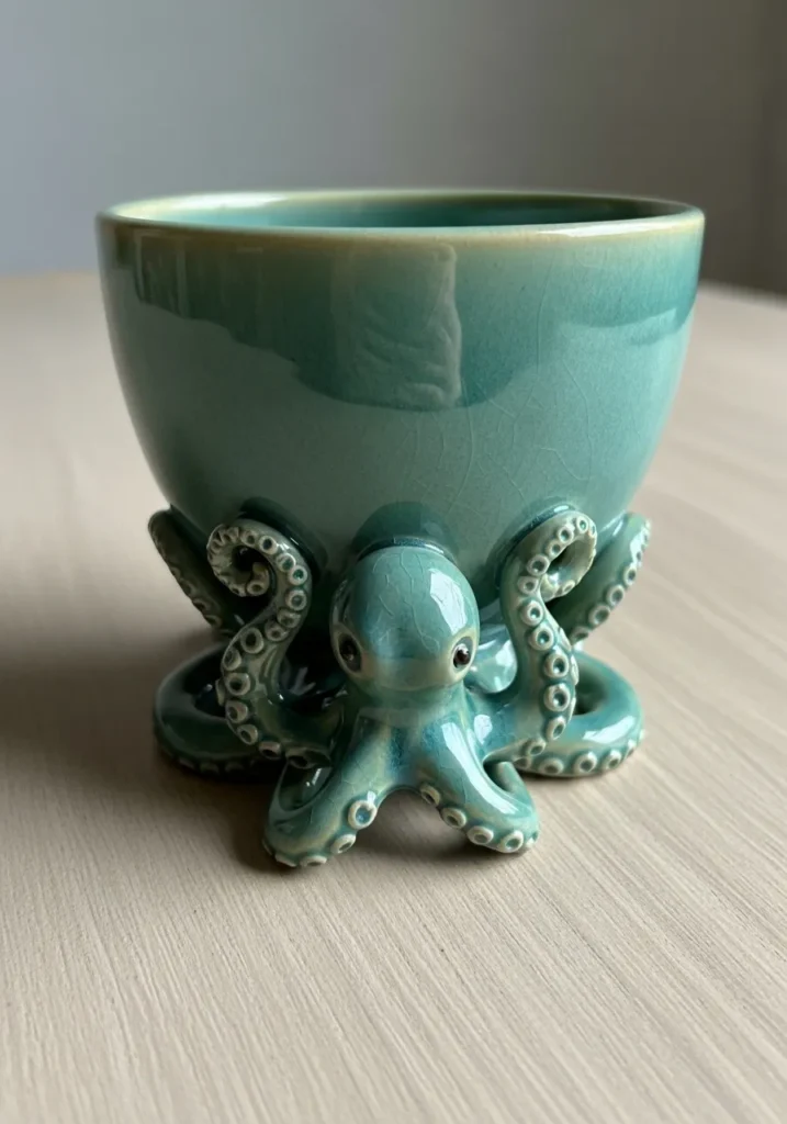 This charming ceramic planter features a glossy seafoam green cup resting on an adorable sculpted octopus base. The octopus wraps its tentacles outward to form sturdy little feet, each one detailed with tiny suction cups for extra texture. The glaze has a soft shine that enhances the curves and brings out the ocean inspired vibe. The cup itself is smooth and minimal, which balances beautifully with the playful sculpted bottom.