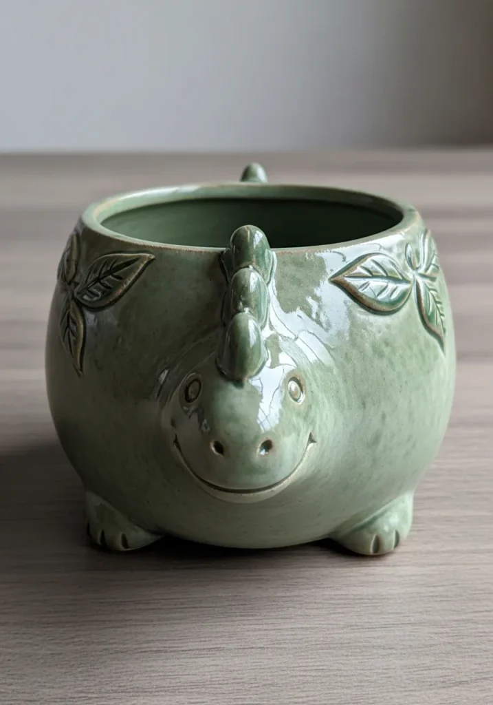 This adorable clay planter pot is shaped like a sweet little animal, complete with rounded cheeks, tiny ears, and soft carved details around the rim. The clay has a smooth, matte glaze in a muted sage green that gives it a calm, earthy feel. Subtle leaf patterns wrap gently around the top edge, adding a handmade touch without overwhelming the design. The slightly chunky feet at the base make it feel sturdy and playful at the same time.