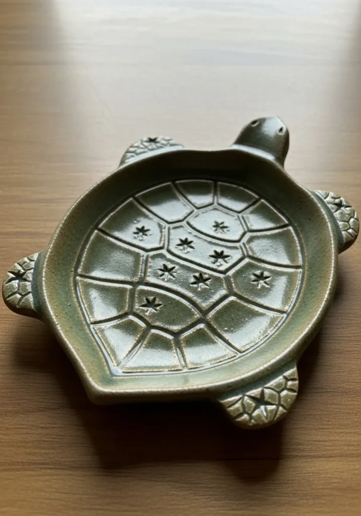 This adorable clay dish is sculpted in the shape of a turtle, with a detailed shell forming the shallow tray area. The shell features engraved geometric patterns, and the soft green glaze gives it a natural, earthy feel. Tiny legs and a small rounded head peek out from the sides, adding a playful touch. The glaze settles slightly into the carved lines, highlighting the design.