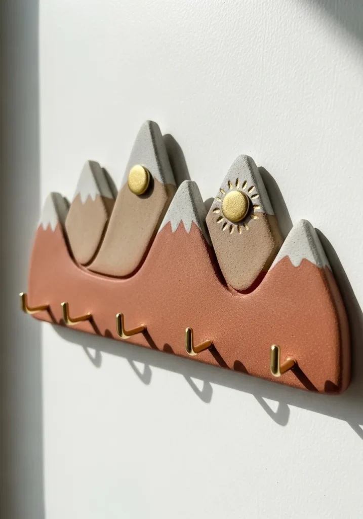 This clay wall piece features a row of stylized mountains in warm terracotta and soft neutral tones. Each peak is topped with a white textured layer to mimic snow, and small round knobs are placed along the lower edge to function as hooks. The design is clean and slightly minimal, with carved lines that define each mountain ridge. The matte finish keeps it looking modern and handmade.