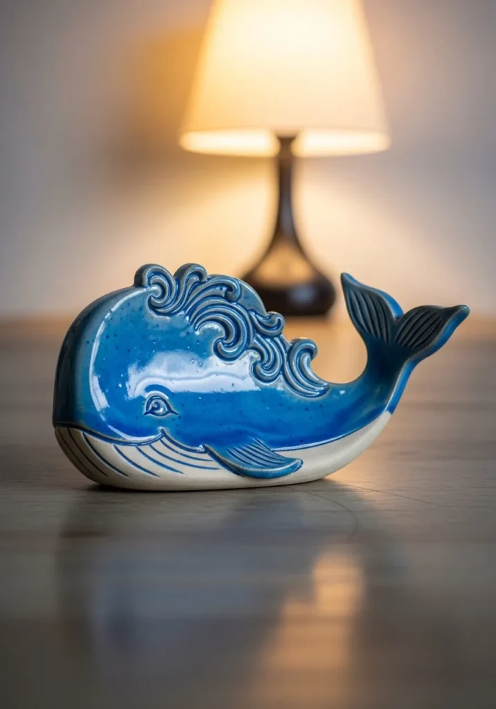 This charming clay whale features swirling carved wave details along its back and a softly curved tail. The glaze transitions from deep ocean blue to lighter aqua tones, creating a sense of movement. The body is smooth and rounded, with raised lines that highlight the splash effect. Placed near a lamp, the glossy surface catches the light beautifully.