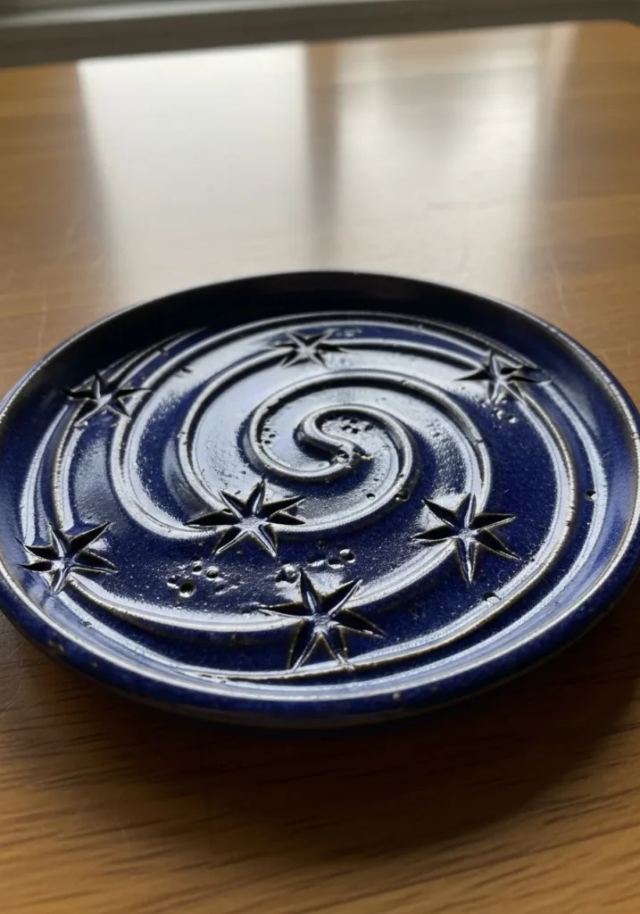 This deep blue clay plate features a swirling galaxy design carved into the center. Curved lines spiral outward, surrounded by tiny star shaped impressions scattered across the surface. The glossy navy glaze pools slightly in the carved lines, creating depth and contrast. The plate has a smooth rim and a slightly raised edge that frames the celestial pattern.