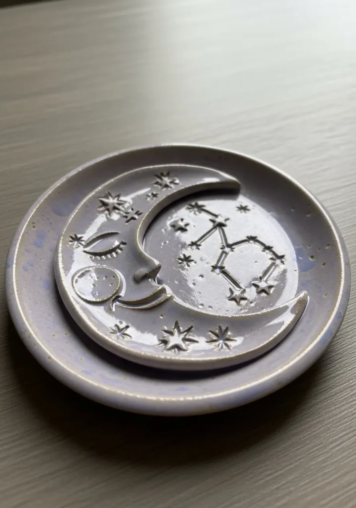 This soft gray clay dish showcases a raised crescent moon surrounded by delicate star and constellation details. The surface has a subtle matte glaze that highlights the embossed elements without overpowering them. Small carved dots and lines create a gentle night sky effect across the plate. The shape is simple and round, allowing the celestial theme to stand out.