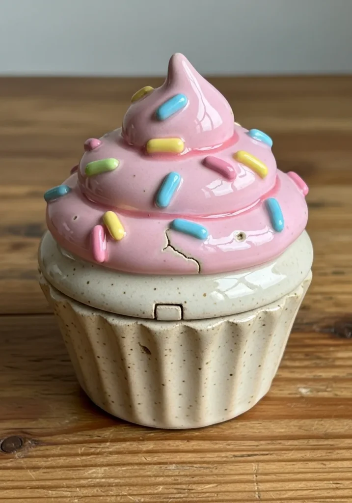 This clay trinket box looks just like a frosted cupcake, with a soft beige base and a swirl of glossy pink “icing” on top. Tiny pastel sprinkles are carefully pressed into the surface, giving it that playful bakery vibe. The base has gentle vertical ridges like a cupcake liner, and the lid fits neatly on top, hiding a small storage space inside. The glaze has a gentle shine that makes the frosting look almost good enough to eat.
