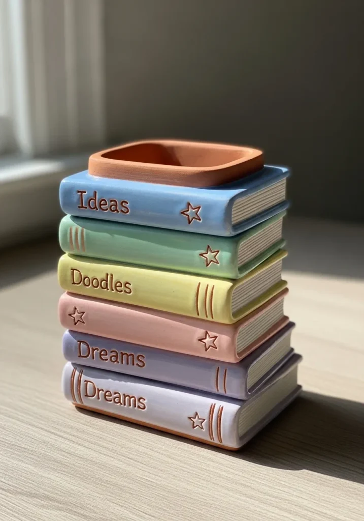 This charming clay piece features a neat stack of miniature books, each one sculpted with soft rounded edges and pastel colored covers. Gentle shades of mint, blush, lavender, and butter yellow give the stack a cozy and creative vibe. Tiny engraved titles and delicate line details add personality, while a small rectangular tray rests on top like a finishing touch. The matte finish keeps everything looking soft and handmade.