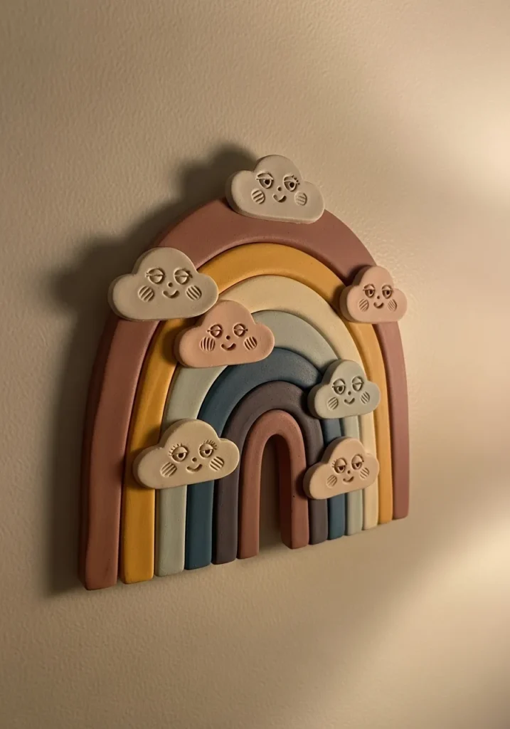 This sweet clay wall decor shows a layered rainbow in muted pastel tones, paired with tiny sculpted clouds. Soft shades of terracotta, dusty blue, sage, and blush stack gently into a curved rainbow shape. The clouds have small raised dot details that add texture and charm. The overall finish is matte and smooth, keeping the look modern and playful.