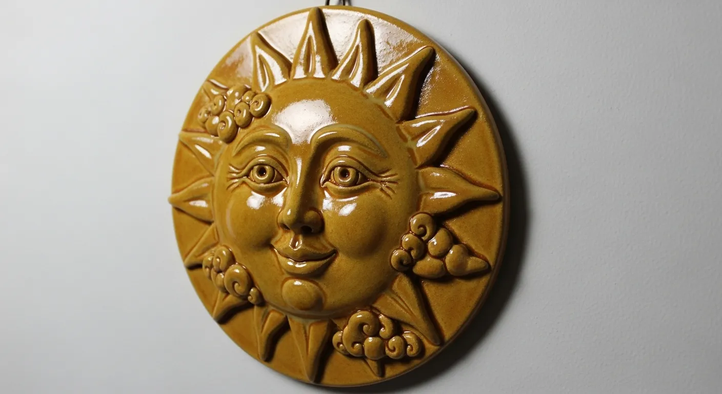This clay wall plaque features a radiant sun with a softly sculpted human face at its center. The warm golden glaze gives it a rich and earthy glow, while the raised rays around the edge create beautiful dimension. Small carved details in each sunbeam add texture and depth, making the entire piece feel carefully crafted. The round shape keeps it balanced and bold on the wall.