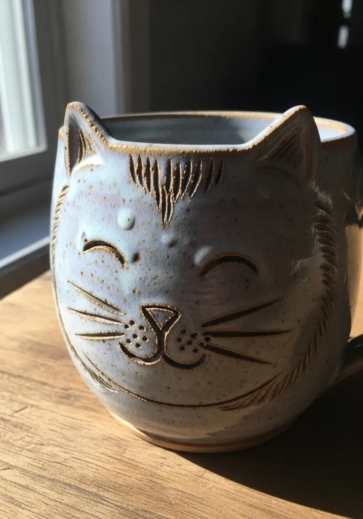 Whimsical Cat Face Carved Mug