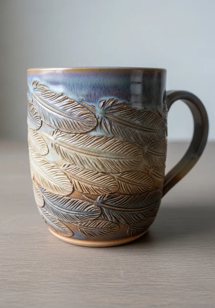 This mug displays overlapping carved feather motifs that wrap around the form in a flowing pattern. The glaze blends earthy browns and muted blues, settling into the carved lines and enhancing the layered effect. The surface feels textured yet refined, with each feather carefully etched into the clay. The rim is slightly darker, framing the design beautifully.