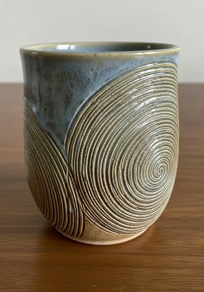 I love carving continuous spirals because they feel almost meditative. The motion of the tool around the mug is steady and satisfying. It is such a confident way to create texture that looks complex but is actually very approachable.