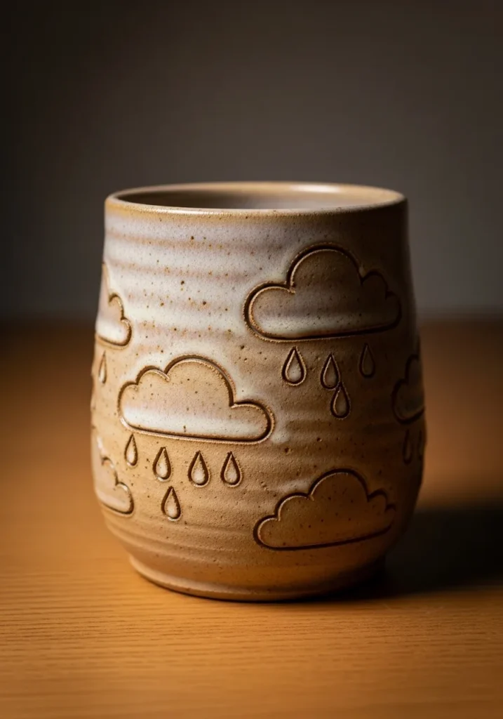 I love simple themed carvings like this because they are easy to personalize. Adding tiny raindrops and refining the curves feels light and fun. It is a sweet way to give a mug personality without overwhelming the form.