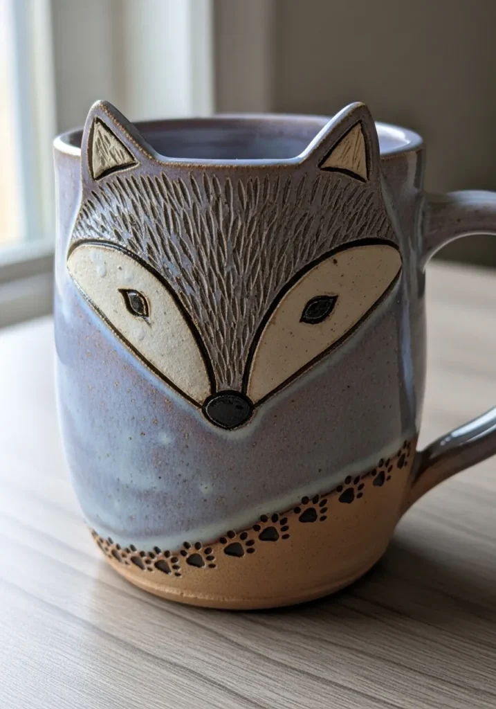 This mug features a carved fox face on the front with raised ears and textured fur lines. The glaze is a soft lavender gray that highlights the detailed carving and gives the piece a gentle handmade charm. The smooth lower band contrasts beautifully with the textured upper section. The expression feels sweet and expressive without being too busy.