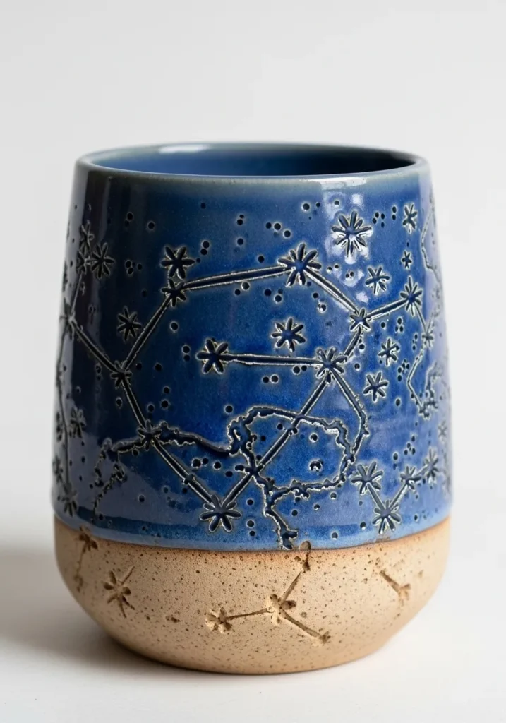 This textured mug showcases delicate carved lines connecting tiny star impressions across a deep blue glaze. The carving creates a subtle map like pattern that feels dreamy and atmospheric. The bottom portion remains a natural clay tone, which grounds the celestial design beautifully. The slight unevenness in the carving adds to its handmade charm.