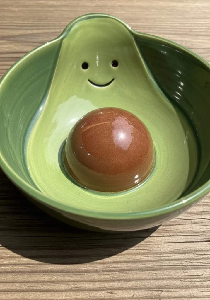 This adorable ceramic bowl is shaped like a cheerful avocado, complete with a rounded brown pit in the center that doubles as a raised feature. The soft green glaze fades gently from light to deeper tones, giving it that fresh, natural avocado look. A tiny smiling face is carved right into the inner curve, adding a playful personality. The glossy finish catches the light beautifully, while slight glaze variations and faint pooling around the edges give it that handmade charm.