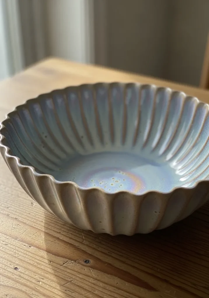 This elegant ceramic bowl features a gently fluted design with soft vertical ridges that run from the base to the rim, creating a beautiful ripple effect. The glaze has a subtle blend of pale blue and warm beige tones, with a slightly iridescent finish that catches the light in a delicate way. Tiny speckles and faint glaze variations add texture and depth, while the scalloped edge gives it a soft, organic shape that feels both modern and cozy.
