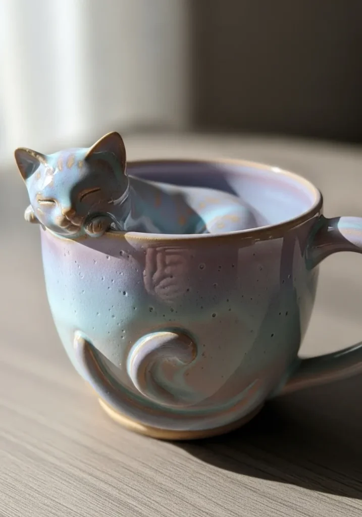 This dreamy ceramic mug features a tiny sculpted cat draped over the rim, eyes closed as if it has dozed off mid cuddle. The surface is finished with a soft iridescent glaze that shifts between gentle blues, lilacs, and warm beige tones, giving it a magical almost pearly glow. Subtle speckles and slight glaze variations add depth, while a raised swirl detail near the base gives the mug a cozy, handcrafted feel. The smooth curves and rounded handle make it look just as comforting as it feels to hold.