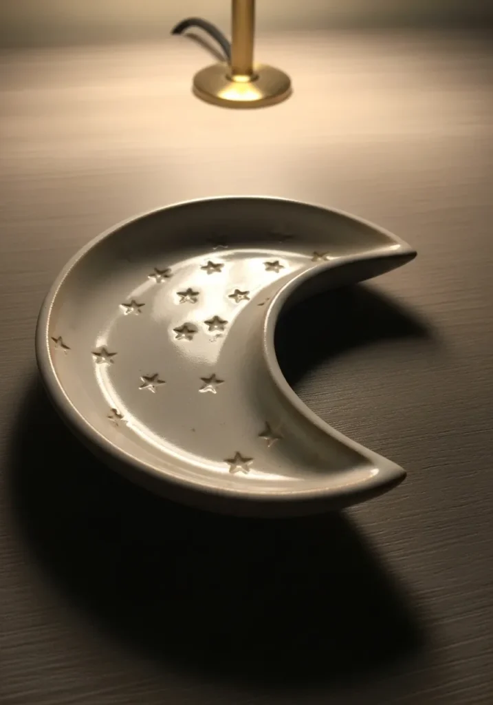 This delicate ceramic dish is shaped like a soft crescent moon, with tiny star cutouts scattered across the surface like a quiet night sky. The glaze is a creamy off white with a smooth satin finish that reflects a gentle warm glow, especially under soft lighting. The curved edges give it a cozy, cradled look, while the small star details add texture and a subtle playful charm. Slight variations in the glaze and faint dimples from the cutouts give it that handmade feel that makes it extra special.