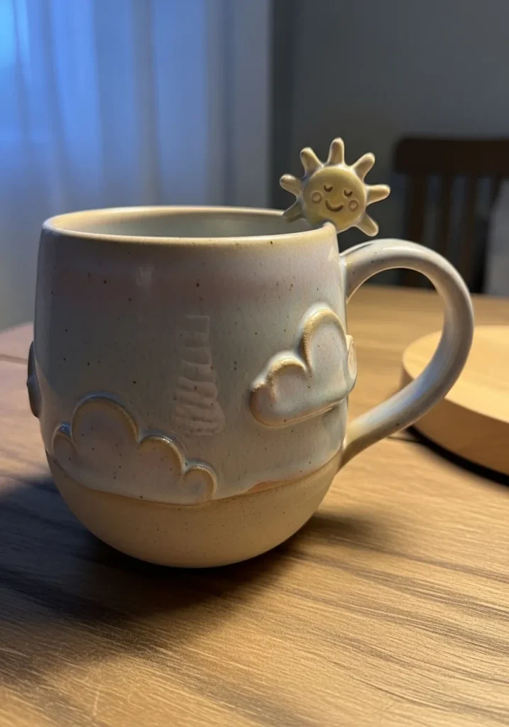 I love how this mug feels like a tiny piece of sunshine in your hands. It is such a fun project to try if you enjoy adding small sculpted details without making things too complicated. Shaping those clouds and that sweet little sun is simple but so satisfying. It turns an everyday mug into something that actually makes you smile, which honestly makes morning coffee feel a bit more special.