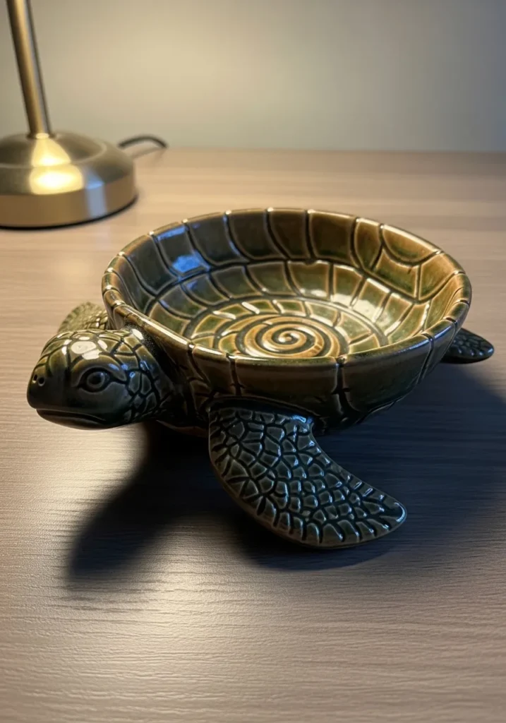 This small ceramic dish is shaped like a turtle with a shallow bowl resting on its shell. The glaze blends earthy greens and soft browns, pooling gently in the carved shell pattern. The tiny head and textured legs add character without overwhelming the form. It feels balanced, detailed, and adorable in close up shots.