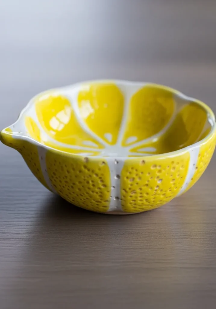 This bright ceramic bowl is shaped like a lemon wedge with carved citrus segments radiating from the center. The glaze is a glossy sunshine yellow with a crisp white interior that makes the design pop. The outer rind is textured slightly to mimic real lemon skin, adding extra visual interest. Its small size and bold color make it instantly eye catching in photos.