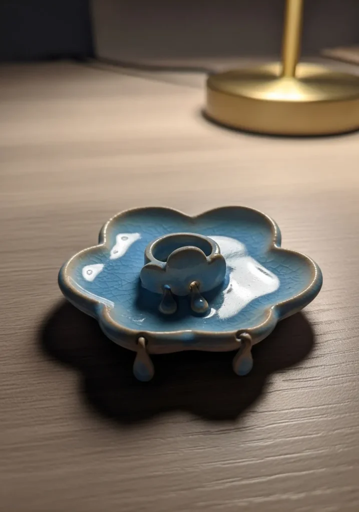 This petite ring dish is shaped like a soft blue flower with rounded petals forming the edges. A small raised detail in the center adds dimension and keeps rings in place. The glossy glaze reflects light beautifully, while the compact size makes it perfect for close up shots. It feels delicate and sweet without being overly intricate.