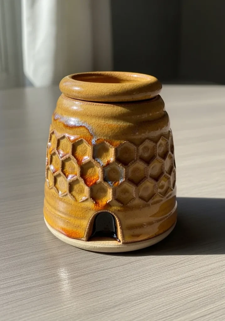 This small cylindrical holder features raised honeycomb textures wrapping around the surface. The glaze blends warm golden amber tones that settle into the hexagon details, creating depth and shine. A tiny arched opening at the base adds character and lets candlelight glow through. It feels cozy and beautifully detailed.