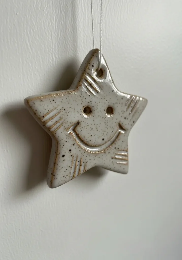This tiny star shaped piece has carved eyes and a curved smile that give it a playful personality. The glaze is a soft speckled beige with a subtle sheen that enhances the carved lines. Its compact size and simple silhouette make it perfect for flat lay or wall styling photos. It feels cheerful and approachable.