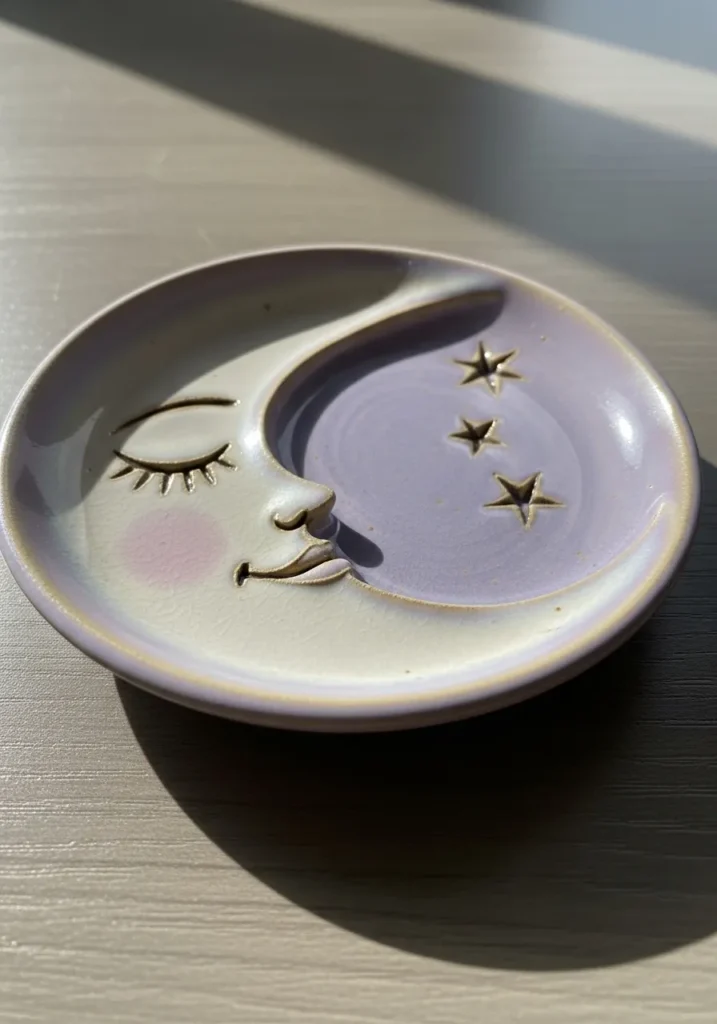This small round plate features a dreamy crescent moon face with tiny star details scattered nearby. The glaze fades softly from pale lavender to creamy white, creating a gentle gradient. The carved features add subtle texture that catches shadows beautifully. Its size makes it perfect for jewelry or small keepsakes.