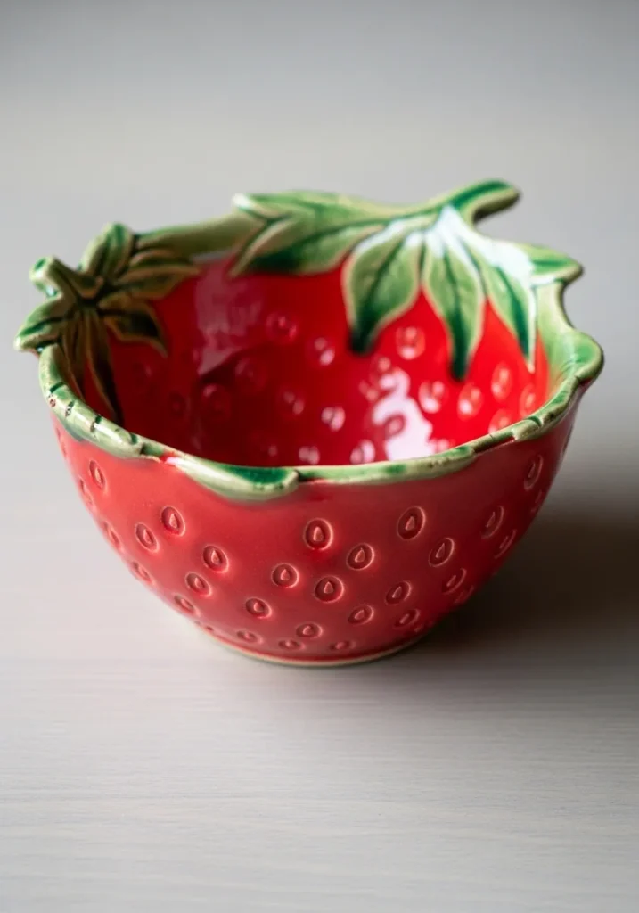 This vibrant red bowl is shaped like a plump strawberry with tiny seed indentations across the surface. The rim is finished with green leafy details that curl slightly outward. The glossy glaze makes the color pop and catches the light beautifully. It is small enough to sit on a bedside table yet bold enough to stand out in pictures.