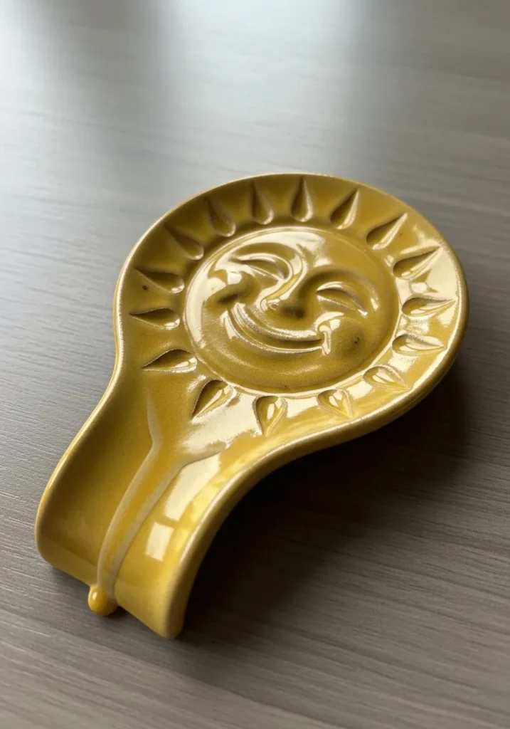 This cheerful spoon rest is shaped like a smiling sun with raised rays circling the edge. The glaze is a warm mustard yellow with a glossy finish that enhances every carved detail. The shallow center is smooth and slightly curved to hold utensils. Its bright tone instantly lights up any flat lay photo.