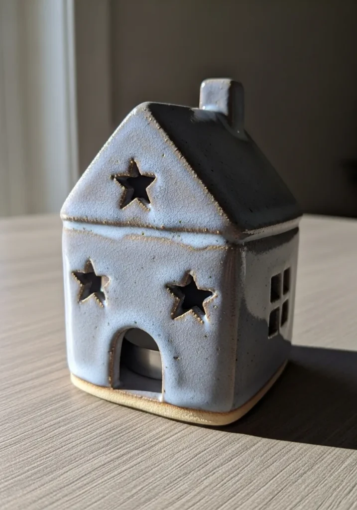 This tiny ceramic house features cutout star windows and a softly pitched roof. The glaze is a pale matte white that allows warm candlelight to glow through the openings. The small scale and clean lines make it perfect for close up photography. It feels cozy and charming without taking up much space.