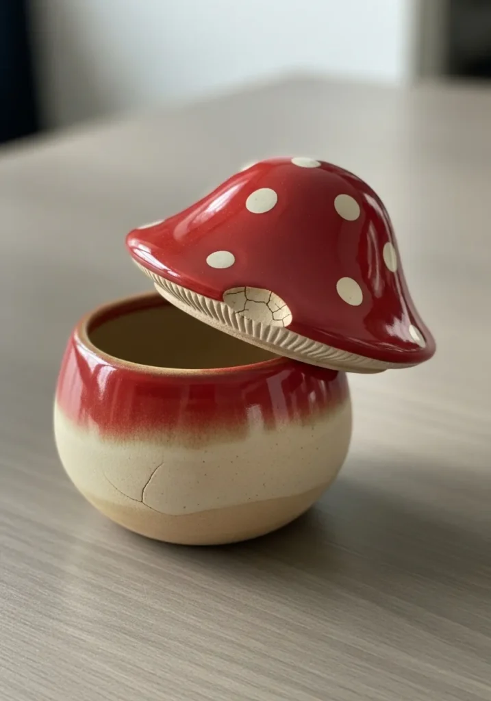 This petite ceramic jar features a rounded cream base topped with a glossy red mushroom lid dotted with small white spots. The glaze is smooth and vibrant, with a soft shine that catches light beautifully in photos. The lid sits neatly on the base, creating a clean silhouette that feels both whimsical and tidy. Its compact size makes it perfect for styling on a shelf or bedside table.