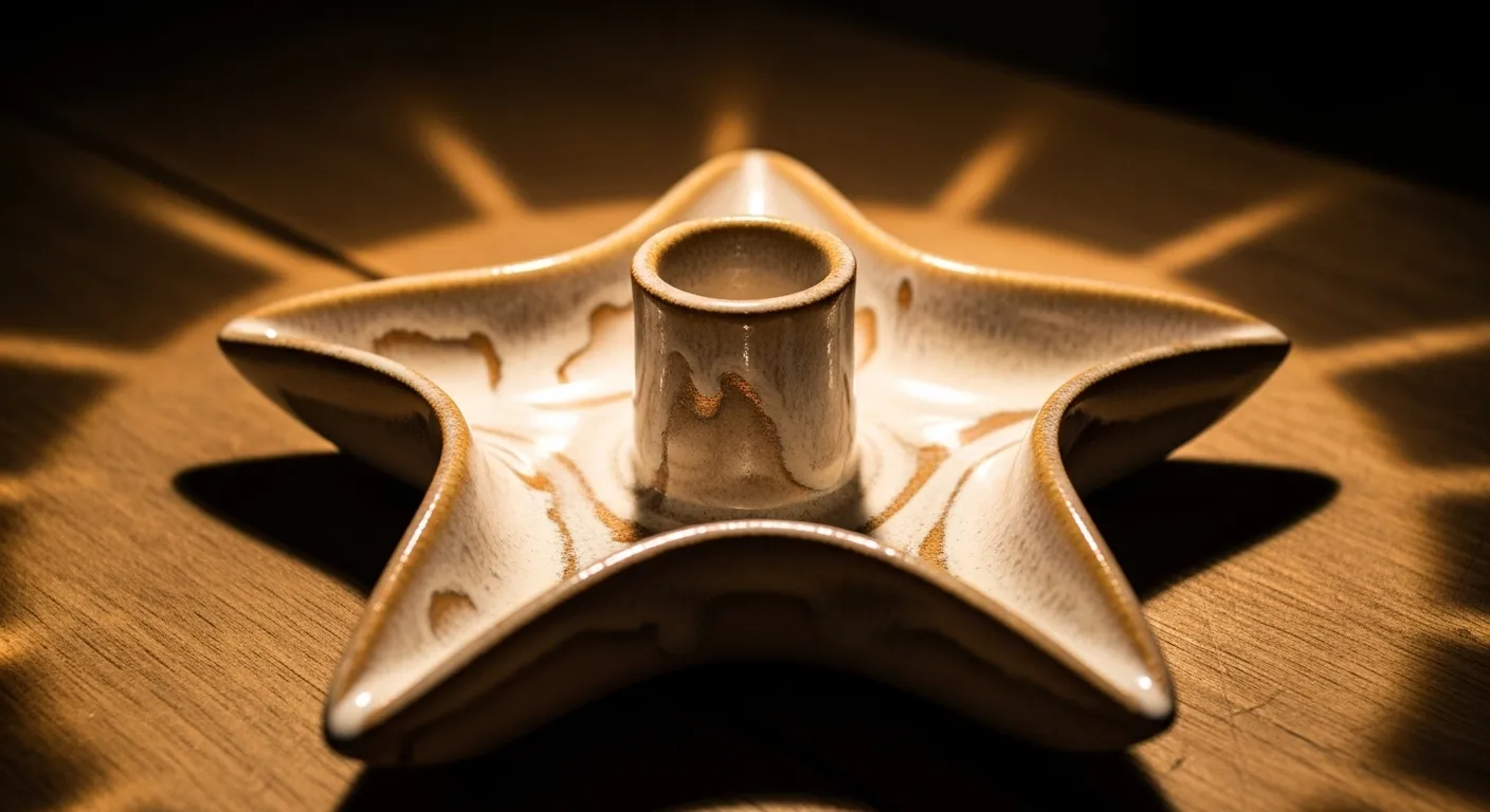 This hand thrown pottery vase has a deep midnight blue glaze with tiny star shaped cutouts scattered across the surface. The body is rounded and slightly tapered at the neck, giving it a classic wheel thrown silhouette. When a small tea light is placed inside, warm light shines through the star openings and casts glowing shapes onto the table. The glossy glaze contrasts beautifully with the soft golden light, creating a dreamy studio vibe.
