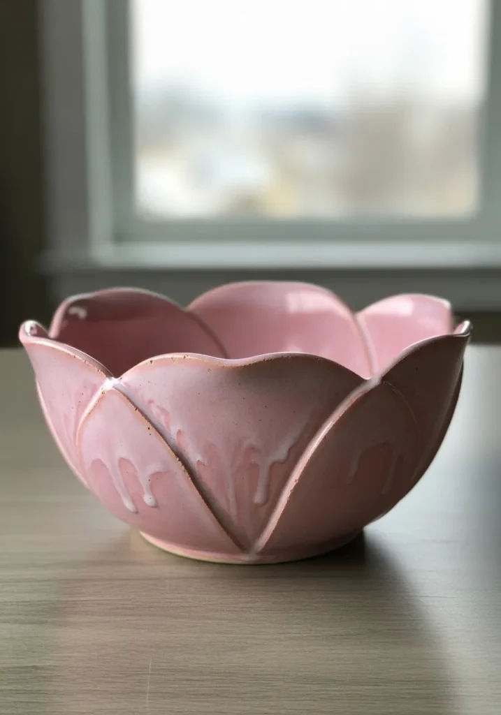 This sweet little bowl is shaped like a blooming flower, with gently curved petals formed right on the pottery wheel. The clay has been smoothed into soft, rounded edges that flare slightly outward, giving it that delicate lotus feel. A blush pink glaze coats the surface, pooling a bit deeper in the creases between each petal and adding subtle dimension. The finish looks glossy but still handmade, with tiny natural variations in thickness that make it feel warm and personal instead of factory perfect.