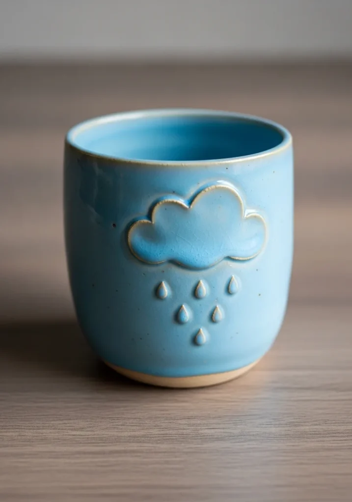 This sweet little cup has a smooth cylindrical shape with softly rounded edges and a clean, even rim. The surface is glazed in a calming sky blue, and the front features a raised cloud with tiny teardrop shaped raindrops falling underneath. The glossy glaze highlights the gentle relief design, giving the piece a soft shine while still keeping that handmade warmth. It feels simple, cheerful, and perfectly balanced in the hand.