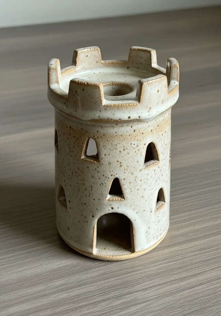 This charming little tower is shaped like a tiny castle turret, complete with carved windows and an arched doorway. The body has a gently tapered cylindrical form, while the top features simple battlements that give it that storybook feel. A creamy speckled glaze coats the surface, pooling slightly in the carved openings and adding depth to the details. The matte sheen makes it feel cozy and rustic rather than overly polished.