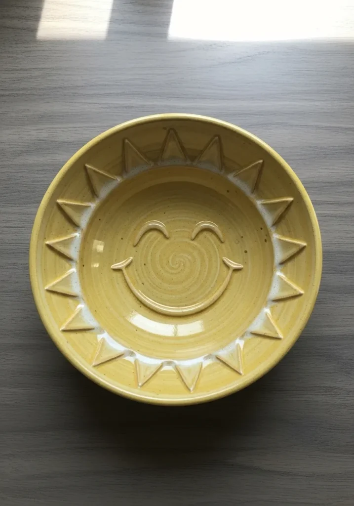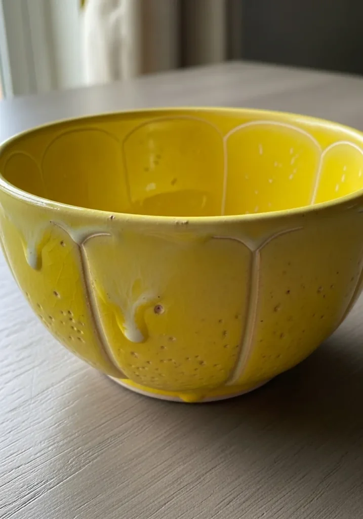 This cheerful bowl has a bright yellow glaze that instantly lifts the mood. The inside features a subtle carved pattern radiating from the center, creating depth and interest while keeping the form simple. The outer edge is smooth and slightly rounded, making it feel comfortable to hold. The glaze shines in the light, especially where it settles into the carved details.