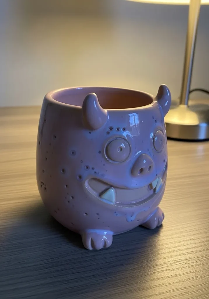 I think whimsical shapes like this are so fun to try once you feel comfortable throwing a simple pot. The base is just a basic cylinder with a slightly rounded belly. Then you get to attach small features like horns and feet, which is great practice for scoring and slipping. When I started adding cute faces to my pieces, it made me feel more creative and less nervous about making mistakes.