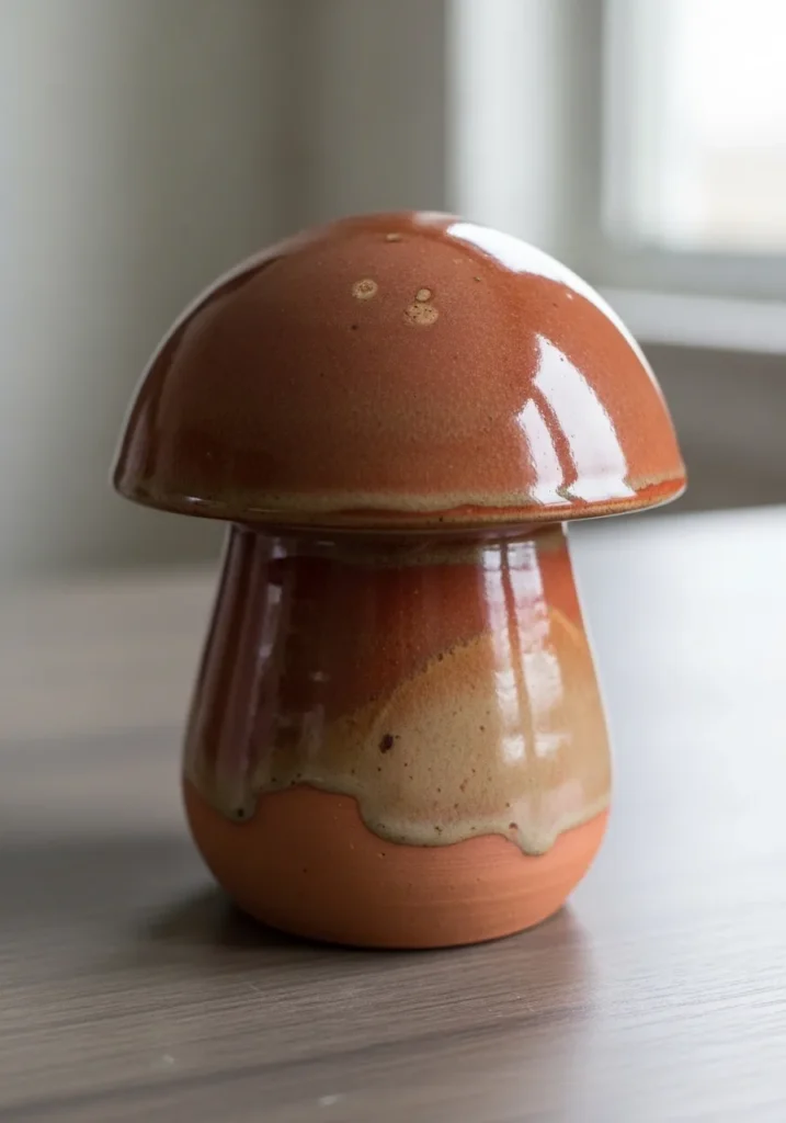 This adorable mushroom has a rounded dome cap and a simple cylindrical stem, both shaped smoothly on the wheel. The glaze blends warm earthy brown with a creamy accent near the base, creating a soft two tone effect. The glossy finish reflects light beautifully across the curved cap, emphasizing its gentle form. It feels minimal yet charming, like a little woodland accent for a shelf.