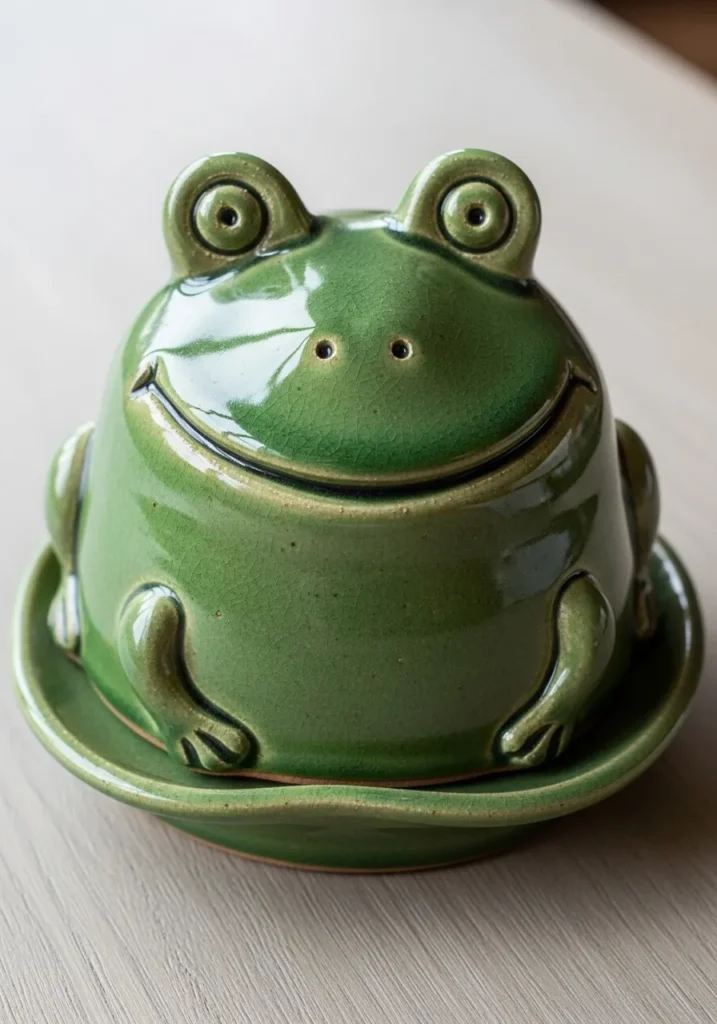 This delightful planter features a rounded body shaped into a smiling frog, complete with raised eyes and subtle sculpted legs. The glaze is a rich glossy green that enhances the curves and playful expression. It sits on a matching saucer that frames the piece and keeps the design practical for plants. The smooth finish and balanced proportions make it feel both decorative and functional.