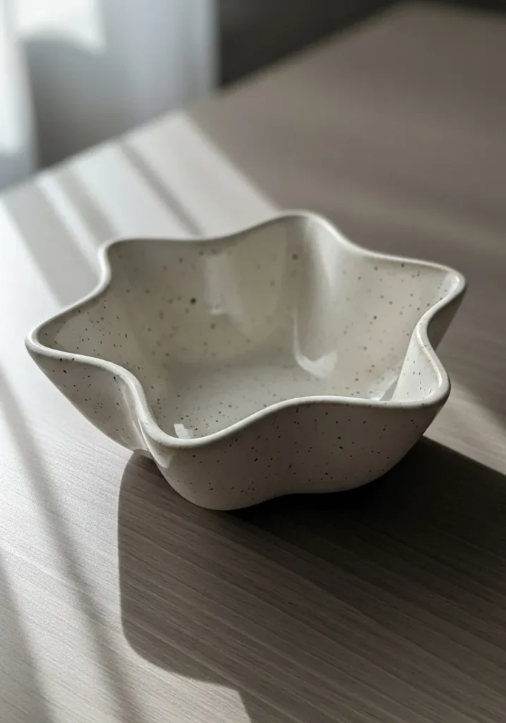 This charming little bowl has a gently flared shape with soft waves pressed into the rim, creating a flower like silhouette. The clay body is coated in a creamy speckled glaze that feels warm and natural. The edges curve in and out in smooth folds, catching the light and creating subtle shadows along each dip. The inside remains glossy and smooth, while the outer surface shows just enough texture to highlight its handmade character.