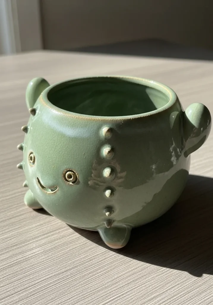 This rounded little planter has a chubby, cauldron inspired shape with tiny rounded feet and cute raised dots wrapping around the body. The soft sage green glaze gives it a cozy, earthy look, while the glossy finish highlights the subtle curves and small sculpted details. The rim is slightly thick and sturdy, which makes the form feel balanced and beginner friendly. Light catches along the bumps and feet, adding dimension without making the design feel fussy.
