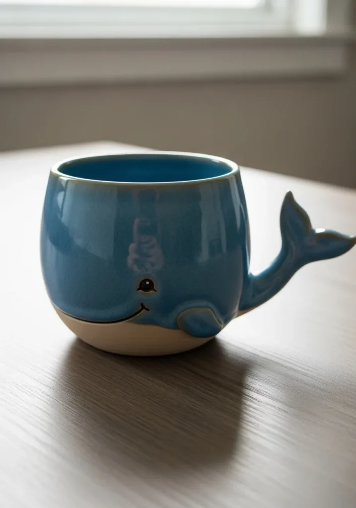 This adorable mug is shaped like a rounded whale, with a small tail extending from the back as a built in handle. The body is glazed in a glossy ocean blue, while the lower portion remains a soft creamy tone for contrast. A tiny eye and subtle curved line suggest the whale’s smile, keeping the design sweet and simple. The form is smooth and bulbous, making it cozy to hold and perfectly balanced on its base.