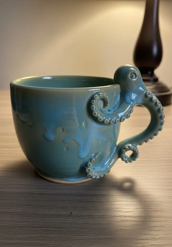 This cheerful mug starts with a classic cylindrical form, but the real magic is in the sculpted octopus that wraps around as the handle. The clay body is glazed in a soft ocean blue, with gentle shading that settles into the tentacle details. Each suction cup is lightly defined, giving the surface texture without overwhelming the clean shape of the mug. The overall design feels sturdy and practical, yet full of character.